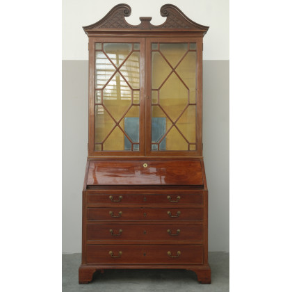 Trumeau inglese di struttura architettonica con cimasa a timpano spezzato. Parte superiore a due ante a vetri, parte inferiore a quattro cassetti con calatoia celante vani, scomparti e cassettini (cm 109x249x54)(difetti)
