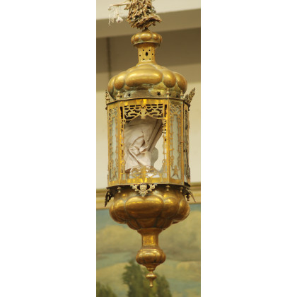 Lanterna in metallo dorato e traforato a motivi vegetali e stemmi( h cm 100) (difetti e mancanze)