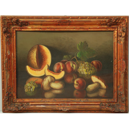 Firma indecifrata "Frutta e funghi" olio su cartone (cm 50 x 70) firmato in basso a destra in cornice (difetti)
