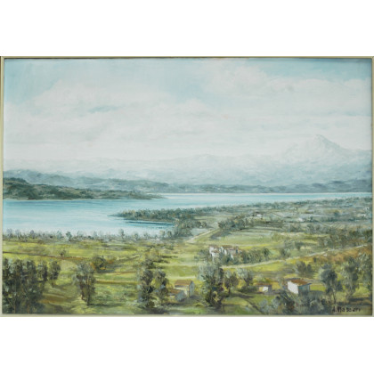 "Lago di Varese" '56 olio su tela (cm 70x100) Firmato in basso a destra, titolato e datato al retro. In cornice