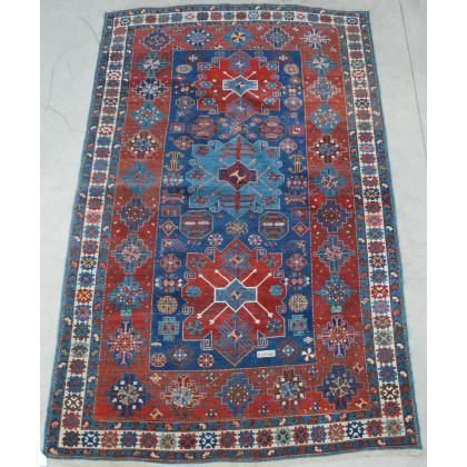 Tappeto Daghestan. Disegno geometrico con tre medaglioni su fondo blu (cm 232x140). Caucaso, inizi del '900 (restauri e difetti)
