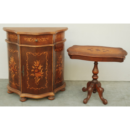 Lotto composto da un credenzino sagomato ad un'anta e un cassetto e un tavolino decorati a mazzi di fiori e volute (difetti)