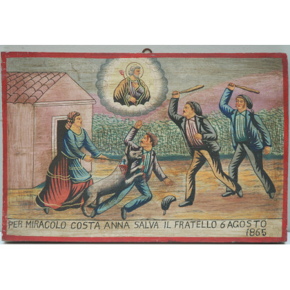 Arte popolare. Ex-voto dipinto ad olio su tavola e datato in basso a destra 1865 (cm 28x43)