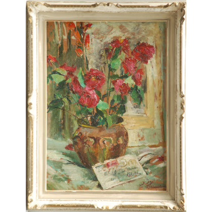 Firma indecifrata "Rose in un vaso" Olio su masonite (cm 68x48) In cornice (lievi difetti)