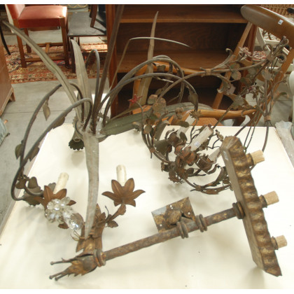 Lotto composto da due lampadari a tre e a sei luci in ferro battuto a motivi floreali e due applique in ferro battuto a due e a tre luci (difetti e mancanze)