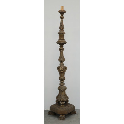 Torciera in legno con fusto intagliato a motivi vegetali e volute. Base sagomata terminante a zampa ferina. Sec XIX (difetti)