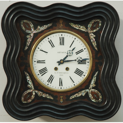 Orologio da parete con cassa ebanizzata. Quadrante decorato in madreperla marcato: "Arnaud-Lione". Fine sec. XIX (lievi difetti)