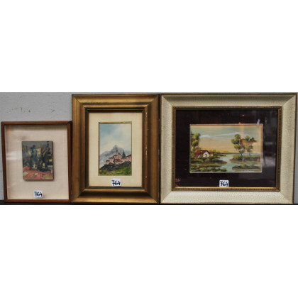 Lotto di tre piccoli dipinti raffiguranti paesaggi in cornice