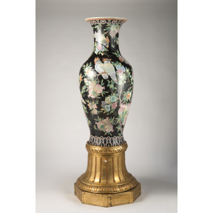 Grande vaso in porcellana "famiglia nera" decorato in policromia a frutta e pappagalli su rami fioriti. Cina, fine sec. XIX - inizio sec. XX. (h cm 95) Poggiante su base in legno dorato, intagliato e scanalato. (h tot cm 137) Large Famille Noire porcelain vase. China, late 19th - early 20th century. Chamfered and carved gilt-wood base