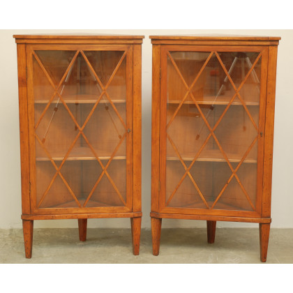 Coppia di angoliere con anta a vetri decorata da listelli, piedi rastremati (cm 65x118x33) (difetti)