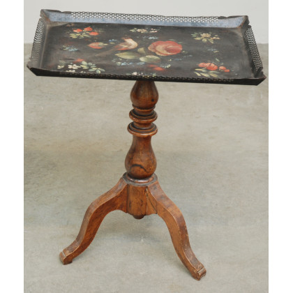 Tavolino con piano tolle-paint decorato a fiori, gamba centrale tornita terminate a tre piedi sagomati (cm 52x57x37) (difetti)