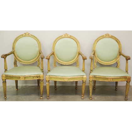 Gruppo di tre antiche poltrone con schienale a scudo, in legno laccato e dorato e intagliato a motivi vegetali. Montanti e gambe torniti e scanalati (difetti)