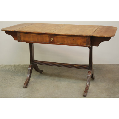 Tavolino inglese con piano ad alette, un cassetto nella fascia gambe traverse scanalate (difetti) (cm 95x79x64)