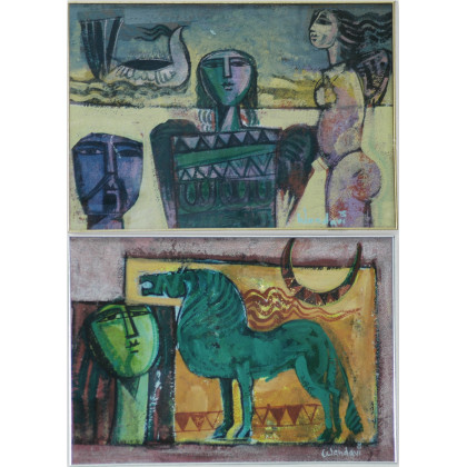 "Mitologia" e "Donna e pesci" coppia di olii su tela (cm 35x50) Firmati e titolati al retro. In cornici