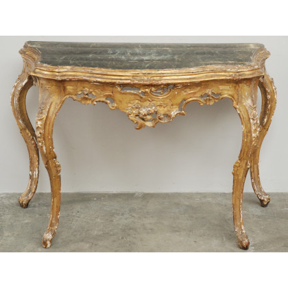 Antica consolle di forma sagomata in legno intagliato dorato traforato a fiori e motivi vegetali. Piano in legno laccato a finto marmo (cm 108x76x54) (difetti)