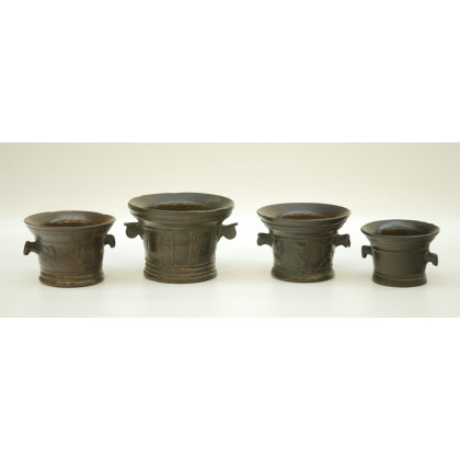 Gruppo di quattro antichi mortai in bronzo con anse zoomorfe, decorati in rilievo. Misure diverse