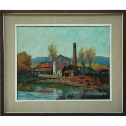 "Alba in fornace. Brianza" olio su compensato (cm 40x50) Firma ed etichetta al retro. In cornice (difetti)