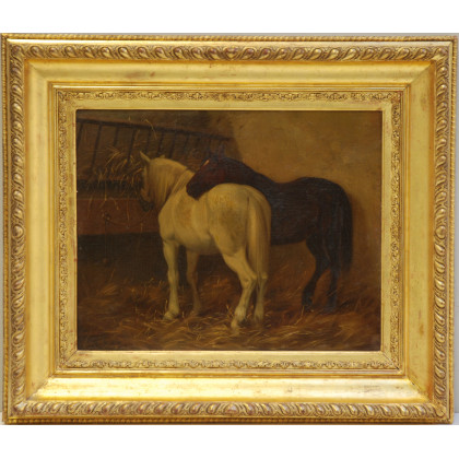 Firma indecifrata "Cavalli nella stalla" olio su tela (cm 33x40) firmato in basso a sinistra, in cornice (lievi difetti)