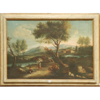 Scuola di Francesco Zuccarelli. "Paesaggio fluviale con ponticello e figure" olio su tela (cm 59x85) In cornice(difetti e restauri)