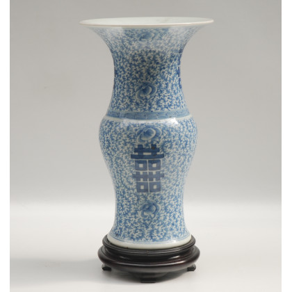 Manifattura di Cina, sec XX. Vaso a balaustro in porcellana bianco blu, decorata a fiori motivi vegetali e simboli. Marchio alla base (h cm 38,5) Base in legno