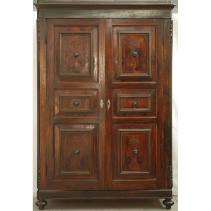 Armadio in legno dolce, due ante pannellate e riquadrate. Piedi anteriori a cipolla (cm 150x108x56) (difetti)
