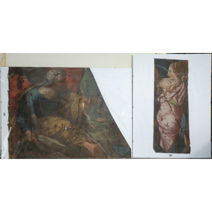 Ignoto. Lotto di due antichi frammenti ad olio su tela di misure diverse (difetti)