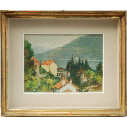 Pittore del sec XX. "Torno. Lago di Como" olio su compensato (cm 17,5x23)