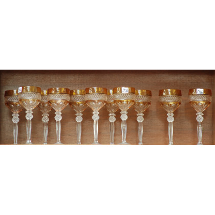 Manifattura di Boemia. Gruppo di undici calici in cristallo incolore e ambrato (lievi difetti)
