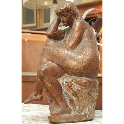 Scultura in terracotta raffigurante donna seduta. Italia seconda metà del sec XX (h cm 54) (difetti)