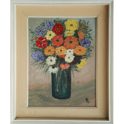 Firma indecifrata. Dipinto ad olio su tela (cm 43x33) raffigurante vaso con fiori