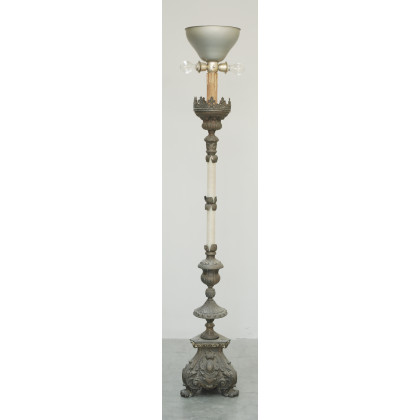 Candelabro in metallo argentato lavorato a sbalzo e parti rivestite in stoffa. Montato a luce elettrica (h cm 172) (difetti)