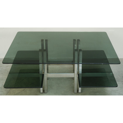 Tavolino da salotto in metallo cromato con tre vetri scuri. Anni '70 del sec XX (cm 96x41x96) (difetti)