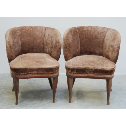 Coppia di poltroncine da camera rivestite in velluto marrone. Esecuzione italiana, anni Quaranta del sec XX (lievi difetti) Pair of upholstered armchairs. Italian production of the 1940's (minor defects)