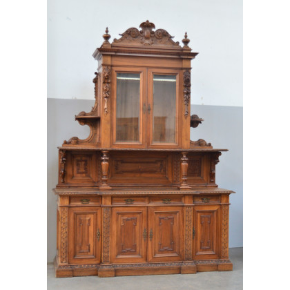 Credenza in legno scolpito a due corpi con parte superiore a con ante a vetri e mensole a giorno. Parte inferiore a quattro ante e ripiani a giorno.(cm 263x205x94) Fine sec.XIX (difetti)