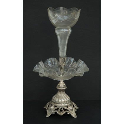 Centrotavola in metallo argentato e vetro decorato a motivi geometrici (h cm 43)(difetti)