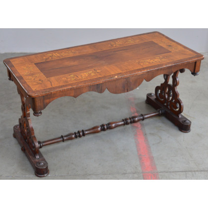 Tavolino da salotto con piano lastronato, filettato e intarsiato a motivi vegetali e montanti sagomati e intagliati. (cm 107x51x48) (difetti)