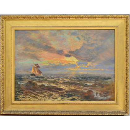 "Veliero in mare tempestoso", olio su tela (cm 77x107) Firmato e datato in basso a destra: "1880" In cornice