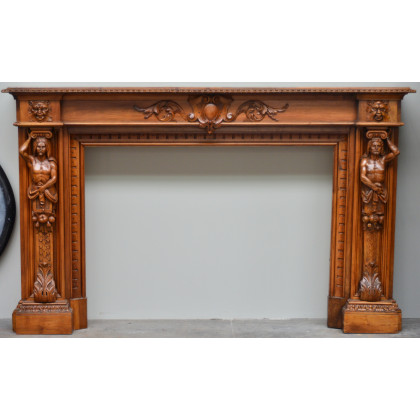 Camino in legno con montanti intagliati da figure virili che sostengono il piano. (cm 220X137X44) Inizio sec.XX