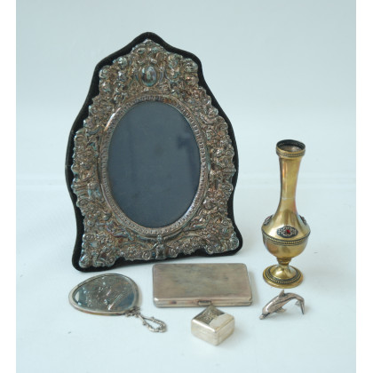 Lotto composto da una cornice da tavolo e tre oggetti diversi in argento e un vasetto in metallo