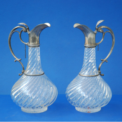 Coppia di versatoi in vetro con ghiere in metallo argentato(difetti)