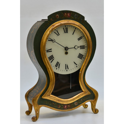 Orologio con cassa in legno di forma sagomata laccata verde con fiori in policromia, quadrante in smalto a numeri romani (cm 54x36) (difetti e mancanze)