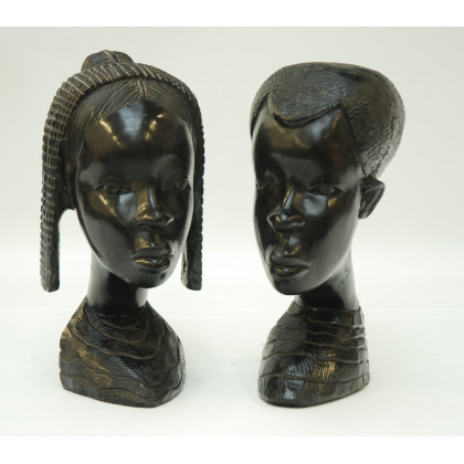 Due sculture in legno ebanizzato raffiguranti teste di africani (h cm 28) (difetti)