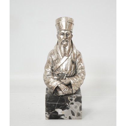 "Ritratto di uomo con barba" Scultura in metallo argentato firmata sulla base a sinistra, poggiante su base in marmo (h cm 29)