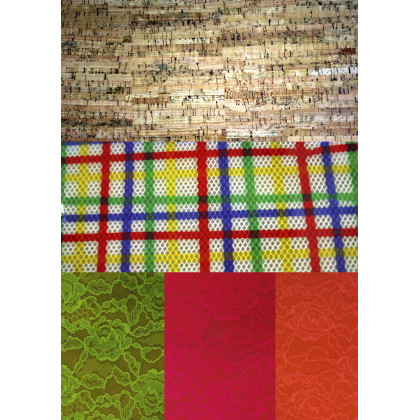 Lotto di n. 52 fogli di Pvc: n. 24 con decoro finto sughero, n. 12 fogli decoro tartan, n. 10 con decoro in pizzo verde, n.3 in pizzo arancio e n. 3 in pizzo fucsia; cm 40x60