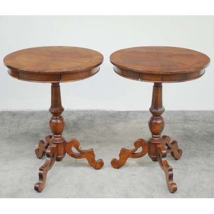 Coppia di tavolini tondi con un cassetto nella fascia, gamba tornita poggiante su tre piedi mossi (cm 70x54)