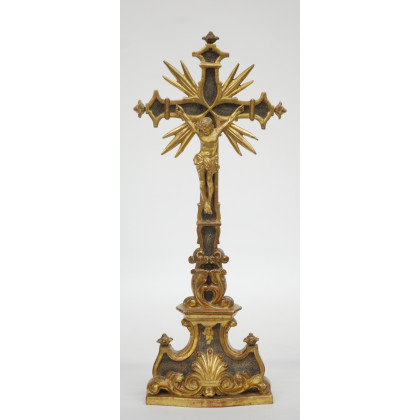 Crocefisso da tavolo in legno dortao e parzialmente laccato. Sec.XIX (h cm 49)(difetti)