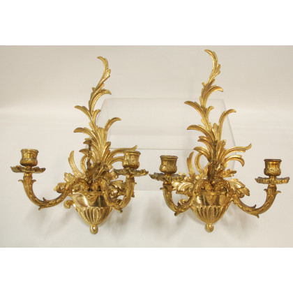 Coppia di appliques a due luci in metallo dorato decorata a motivi fogliacei