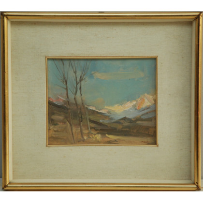 Firma indecifrata. "Paesaggio montano", olio su compensato (cm 16x20) In cornice (difetti)