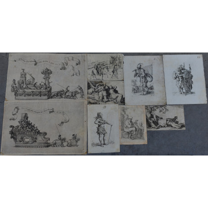 (Antichi maestri) Coppia di incisioni all'acquaforte raffiguranti due carri trionfali: Carro trionfale della Compagnia di S. Rocco... (Numerata in alto a sinistra 2). Inventione della Confraternita di Servi... (Numerata in alto a sinistra 4). Sec. XVII, provenienti da un libro di feste. Dimensioni varie. Si uniscono altre sette incisioni varie. Mende. Lotto di nove fogli