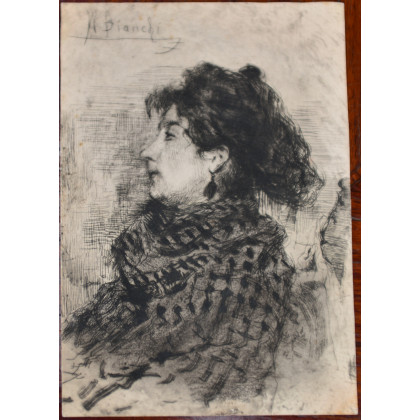 (Incisioni dell'Ottocento) Mosè Bianchi (Monza, 1840 -1904). Giovane donna vista di profilo. Acquaforte originale firmata in lastra in alto a sinistra. Al verso del foglio frammento di un'altra incisione con firma "Bianchi". Dimensioni foglio mm 128x89, rifilata entro la battuta del rame. Bella prova vellutata e ricca di plein tone, trattasi probabilmente di una proof, l'incisione al v. presenta un primo abbozzo di pulizia del rame con la tarlantana, tipiche delle prove